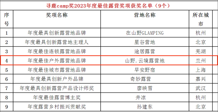 近日,中國旅游景區(qū)協(xié)會露營分會和中國車船協(xié)會房車露營分會指導(dǎo)支持的狐小旅首屆全國露營主理人大會暨2023“尋鹿CAMP”頒獎典禮在途居南通開沙島露營地舉行。甘肅文旅集團(tuán)旗下石佛溝國家森林公園山野云境露營地榮獲“首屆尋鹿CAMP獎2023年度最佳戶外露營地品牌獎”獎項(xiàng)。