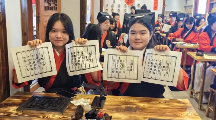 在河口古鎮(zhèn)的國學活字印刷研學館,港澳青少年們親自動手體驗了古代的活字印刷術。他們小心翼翼地擺放著字模,用墨汁輕輕刷過,再將宣紙覆蓋其上,輕輕一壓,一幅幅唐詩便躍然紙上。他們齊聲用粵語朗誦了“憫農”“春曉”“相思”等經(jīng)典唐詩,不僅領略了民間藝術的獨特魅力,更在實踐中感受到了中華文化的博大精深。